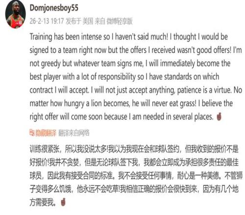 到目前为止,琼斯都没有获得一份合同。其实在过去一段时间,琼斯在NBL打球,后续回到美国养伤。无奈这波养伤之后,琼斯并没有回归到CBA。根据他曝光的动态来看:我以为我现在会和球队签约,但我收到的报价不是好报价!这样的话语已经非常明显了,他之所以没有回到CBA,就是因为薪资没有到位,所以他始终都没有谈妥。