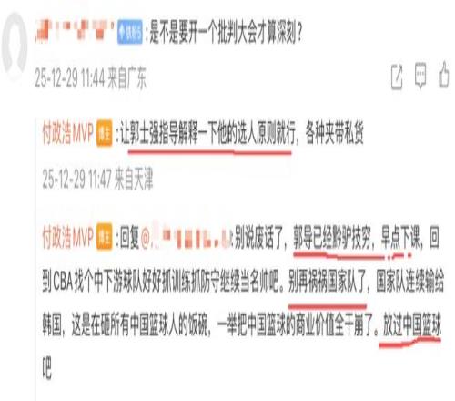 付政浩在和网友互动时直言:“又开启了新一轮装模做样的CBA球员考察”,并且一针见血指出:“郭导已经黔驴技穷,早点下课,回到CBA找个中下游球队好好抓训练抓防守继续当名帅吧。别再祸祸国家队了,国家队连续输给韩国,这是在砸所有中国篮球人的饭碗,一举把中国篮球的商业价值全干崩了。放过中国篮球吧。”